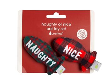 One crinkle “naughty” fish toy and one rattle “nice” toy, each in festive Christmas colors with a catnip pouch