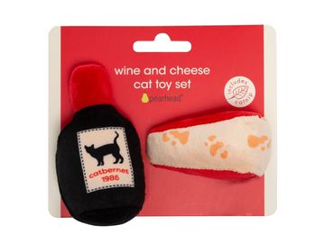 Plush toys: a triangle cut of cheese that crinkles and a bottle of “catbernet 1986” red wine with a rattle; Each toy includes a catnip pouch