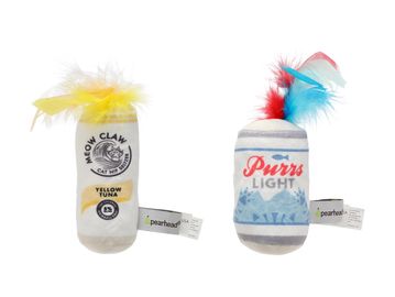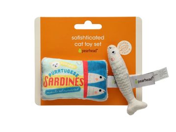Two plush cat toys: one crinkle sardine and one plush sardine tin