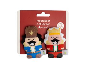 One blue nutcracker crinkle toy and one red nutcracker rattle toy, each with their own catnip pouch